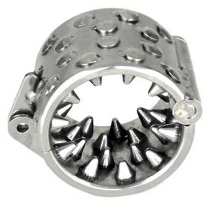 Cet anneau de chastet�é en m�étal est con�çu avec des pics de 9mm qui viennent donner des sensations extr�êmes lors de la soumission. En effet, cet anneau emp�êche l’�érection sous peine de douleurs.Diam�ètre de l’anneau de 40mm. Largeur de 2cm.Avec le cadenas